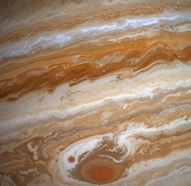 La rotazione rapidissima influenza profondamente l’atmosfera di Giove. Le sue celebri bande colorate, visibili anche con piccoli telescopi, sono il risultato di potenti correnti atmosferiche che si muovono a velocità estreme. Queste correnti sono organizzate in fasce parallele all’equatore, separate da violenti getti di vento che possono superare i 600 km/h.